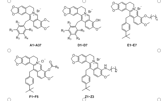 本发明公开了一类小檗碱衍生物在防治核果褐腐病中的新用途。该类衍生物对核果褐腐病菌(Monilinia fructicolaACCC 36263)表现出优异的抑制活性,在50 μg/mL浓度下多数化合物抑制率达100%。部分衍生物(如A17、A31、A37、D2)的EC??值低于1 μg/mL,优于小檗碱和嘧霉胺,且与阳性对照纳他霉素相当。小檗碱衍生物结构通式如下所示: