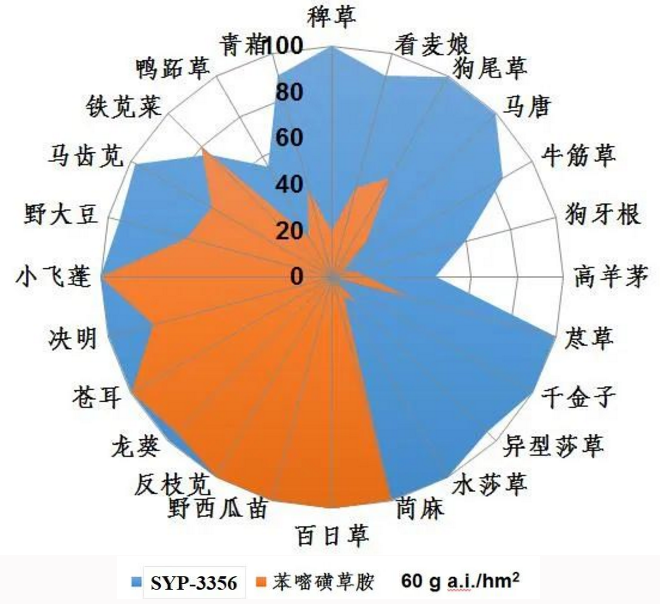 图1 苯嘧草唑(SYP-3356)与苯嘧磺草胺杀草谱对比试验