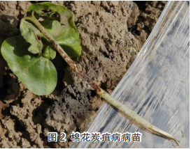 - 病害症状:棉花炭疽病在各生育期均可发病,以苗期和铃期受害最重。苗期发芽后出苗前受害可造成烂种,使棉苗不能出土而死亡。出土后幼苗感病时,茎基部出现红褐色至紫褐色条斑,后扩大成略凹陷的褐色斑(图2),严重时失水纵裂,幼苗倒伏死亡。潮湿时病斑上产生橘红色粘质物,即分生孢子。子叶发病后多在叶边缘生出红褐色的半圆形褐色病斑,后干燥脱落使子叶边缘残缺不全。成株期发病可为害叶及茎部,但主要为害棉铃。叶片发病时产生易干枯开裂的不整圆斑(图3)。茎部被害时呈红褐色至暗黑色,圆或长形的中央凹陷病斑,表皮常破裂露出木质部,病株遇风易折断。棉铃发病时初生紫红色小点,后逐渐扩大为圆形或近圆形且稍凹陷的褐色病斑。潮湿时,在病斑中央产生橘红色略带轮纹和粘结的分生孢子团(图4)。病斑可相互连接,扩大到全铃,铃内未成熟的纤维部分或全部腐烂,成为暗黄色的僵瓣。