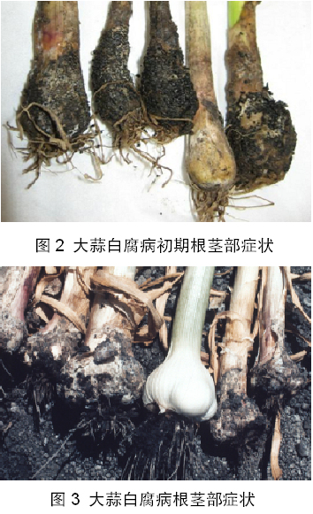 - 引发大蒜白腐病的病原为半知菌亚门真菌白腐小核菌(Sclerotium cepivorum Berk.)其菌丝在10~20℃的PDA培养基上生长5~7天,便可形成球形或扁球形的黑色菌核,表面光滑,条件适宜时,菌核萌发形成菌丝,白色的绒毛状稀疏菌丝生长最适温度为12~19℃。在地面或蒜种越冬的病原,通常可借雨水或灌溉水传播,并直接从根部或近地面处侵入大蒜,引发菌核病。病害症状大蒜白腐病在生长期和贮藏期均可发病。大蒜萌发期,带菌蒜种在表皮下形成黑色菌核,严重的直接导致蒜种不发芽或生根不良,随后在蒜种表面呈水渍状凹陷,软化腐烂,表面形成白色菌丝和黑色球形菌核。大蒜幼苗返青期,受侵染的植株叶片发黄,长势极弱,由下部叶片向上部叶片发展,植株在田间极易拔出,其根部软化腐烂,根以及腐烂的鳞茎表面附有大量白色菌丝和黑色球形菌核,受害严重的植株很快枯死,造成田间缺苗。进入蒜薹生长期,蒜薹、蒜瓣已开始分化,随着田间植株抗病能力的增强以及气温升高,不再出现大量死苗,但受侵染植株长势较弱,生长不良。大蒜收获后贮藏期间,带菌蒜瓣上的病原以菌丝形态潜伏,少数在蒜瓣表面形成浅褐色凹斑。
