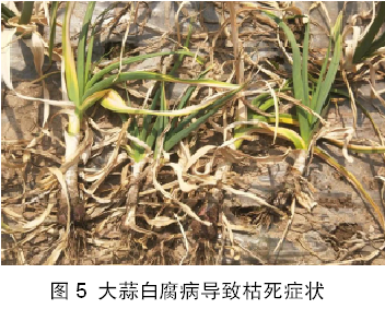 - 防治技术针对大蒜白腐病的防治,首先要精选优质蒜种,并在进行种子消毒后,播种于3~4年以上的非葱蒜类作物轮作地块,或进行水田轮作的地块。早春及时追肥提苗,以增强蒜株抗病力。发现病株及时挖除,最好掌握在形成菌核前进行。虽然目前暂无针对大蒜白腐病进行登记的药剂,但可在田间零星出现白腐病斑点的初发阶段,选用或50%多菌灵可湿性粉剂 500倍液,或50%甲基硫菌灵可湿性粉剂600倍液等相关药液,每隔10天轮换喷施或灌淋根茎1次,连续1~2次即可。贮藏期也可用上述杀菌剂喷雾预防。