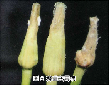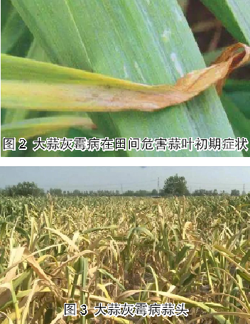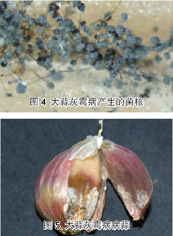 - 引发大蒜灰霉病的病原为半知菌亚门真菌葱鳞葡萄孢(Botrytis squamosa Walker)和葱腐葡萄孢(Botrytis aclada Fresen =B.allii Munn)。暗褐色的葱鳞葡萄孢的分生孢子梗有节或疣,基部较宽,向上略细,2/3高度处开始分枝,分枝处明显缢缩。产孢细胞圆球形,其基部有一横隔膜。卵圆形到长卵形的无色分生孢子稀疏。初为白色菌丝团的菌核后渐成黑色,长圆形到肾形。圆球形的无色性孢子丝精座有一无色短柄,群体略呈灰色。遗落于田间的灰霉病病原病残体和土壤中的菌核,可较长期地存活。在15℃左右和80%以上的相对湿度环境中最为活跃,分生孢子可随气流、雨水或灌溉水传播,并从伤口侵入大蒜。感病的蒜苔收获后,潜伏其上的菌丝体、菌核在贮藏低温条件下,引起病部产生的分生孢子借气流传播蔓延,从伤口或枯死部位侵入,并可引发灰霉病。病害症状大蒜灰霉病主要为害叶片,一般先侵染老叶,并从叶端向下蔓延。发病初期的叶片,两面均会产生褪绿小白点或浅褐色的小圆点,后沿叶脉方向扩展成梭形或椭圆形水渍状病斑,后期连接成长条形大病斑,并变白色至浅灰褐色,湿度大时密生较厚的灰色绒霉层,严重时可由叶片蔓延至叶鞘及上部叶片,遍及整株,致使叶片变褐、枯死,或呈水渍状腐烂。下部老叶发病后,可继续蔓延至叶鞘及上部叶片,乃至整株叶片,枯叶表面有不规则形的黑色菌核,植株较易拔起。蒜头蒜薹贮藏期间可继续为害,蒜瓣干枯,表面长出灰霉。蒜薹灰霉病是许多城市蔬菜冷库的毁灭性病害,蒜苔入库后3~4个月即见发病,一般先从梢部开始发病,以后向下蔓延,可在蒜薹上形成长条形或不规则形褐色凹陷的病斑,后软化腐烂,生出灰色霉状物。有时腐烂部分绕蒜薹一周,发病部位缢缩,甚至薹苞腐烂,产生灰霉。