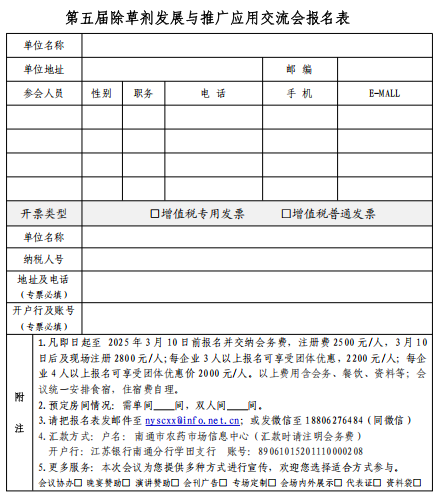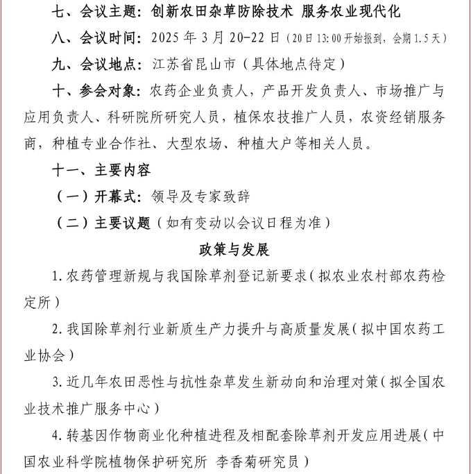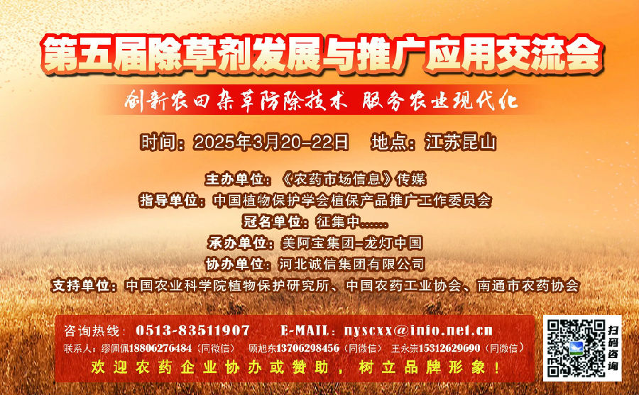 针对以上情况,《农药市场信息》传媒和中国植物保护学会植保产品推广工作委员会研究决定,在以往成功召开四届除草剂会议基础上,定于2025年3月20-22日在江苏昆山举办第五届除草剂发展与推广应用交流会,以期寻找除草剂研发和杂草治理新的思路、新的突破和新的解决方案。