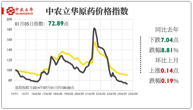 2025年1月5日,中农立华原药价格指数报72.89点,同比去年下跌8.81%,环比上月上涨0.19%。跟踪的上百个产品中,同比去年63%产品下跌;环比上月84%产品持平,4%产品上涨。