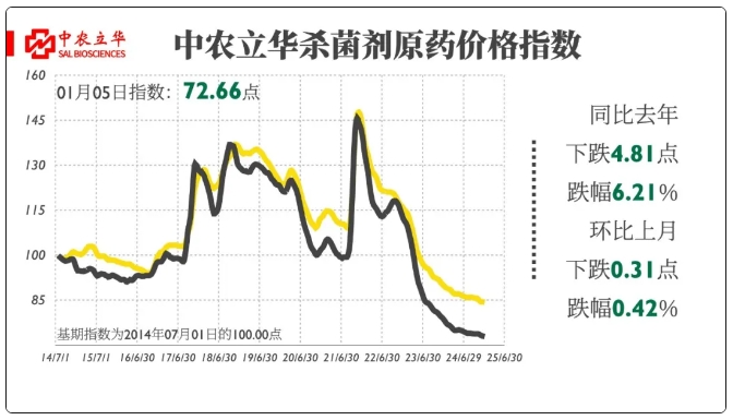 2025年1月5日,中农立华杀菌剂原药价格指数报72.66点,同比去年下跌6.21%,环比上月下跌0.42%。