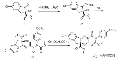 茚虫威的合成以关键中间体茚甲酯(5-氯-2,3-二氢-1-氧代-1H-茚-2-羧酸甲酯)为原料经过不同的单元反应,可分为以下3条路线。