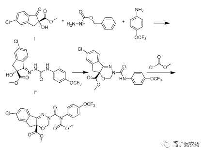 路线3:以路线1中的化合物I、肼甲酸苄酯和对三氟甲氧基苯胺为原料,经缩合和胺化、闭环和酰化反应得到茚虫威。