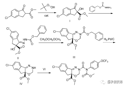 路线1:以关键中间体茚甲酯为原料经氧化、缩合、闭环、催化加氢脱保护,然后与酰氯化物(化合物VI)反应等5步反应得到茚虫威,其中酰氯化物是以4-三氟甲氧基苯胺为原料经酰化与光气化2步反应制得。