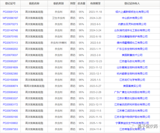 国内共有45个高效氯氟氰菊酯原药登记。其中富美实公司登记有精高效氯氟氰菊酯。国内最大的生产企业实扬农。其他主要生产厂家还有春江、立威和润农等