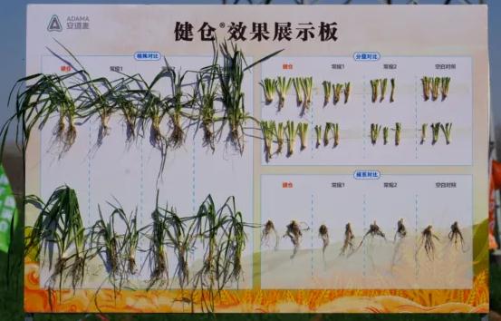 据了解,健仓®为30%嘧菌酯·咪鲜胺铜盐·噻虫嗪悬浮种衣剂,是安道麦专为大田(小麦、花生)市场重拳打造的一款专利种衣剂。从当天观摩情况来看,使用了安道麦健仓®方案的示范田,小麦叶色浓绿,长势健壮,根系旺盛,茎基部干净、粗壮,有效分蘖多,与市面主流竞品相比,防控小麦茎基腐病、纹枯病、根腐病等根茎部病害的效果更胜一筹。而健仓®方案在花生根腐病、白绢病的防控上,同样展现出较好的市场潜力。