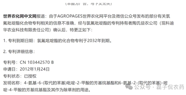 一种是认为世界农化网的更正消息,专利号为:CN103442570B,其化合物专利于2012年1月24日申请,2032年1月到期。
