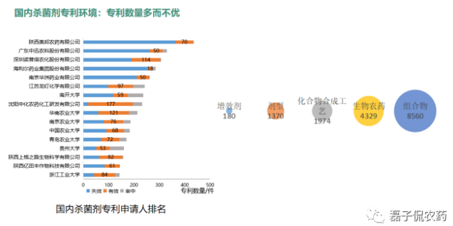 4)生物农药杀菌剂专利数量多,大多来自国内农业高校,叫好不叫座。