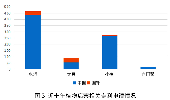 大豆主要关注的病害依次是大豆根腐病,大豆锈病和大豆包囊线虫。值得关注的是大豆的种衣剂和种子处理相关应用技术,也是大豆病害防治的主流应用专利布局点。无论从活性成分,还是作物的相关应用专利梳理,都可以看出,种子处理技术,尤其是包含杀菌、杀虫和植物营养的种子处理技术是目前国内企业研发的重点方向。另外生物农药的新专利申请数量也增长迅速。因此提高农药使用效果和利用率,以及生物农药的使用推广都是未来炙手可热的应用方向。