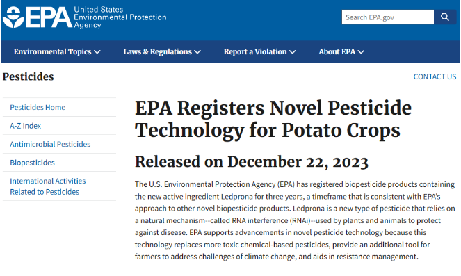 2023年12月22日,美国环保署(EPA)发布公告正式批准创新生物农药Ledprona,引领农业进入可持续虫害控制新时代。