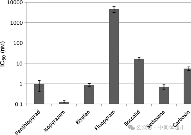 研究通过提纯立枯丝核菌的线粒体进行酶活测试,对比了多种SDHI类杀菌剂的抑制效力。结果表明,氟唑环菌胺对SDH酶表现出极高的内在抑制活性,其半数抑制浓度(IC50)低至0.7 nM,其效力在测试化合物中名列前茅,这为其高效的田间防效奠定了分子基础。