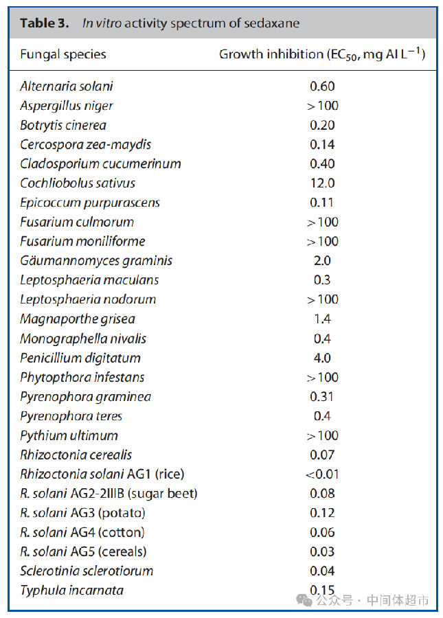 体外活性测定显示,氟唑环菌胺对除卵菌外的多种病原真菌具有广谱活性。其对不同融合群的立枯丝核菌和禾谷丝核菌活性极高(EC50 <0.01 至 0.12 mg a.i./L)。同时,对引起雪霉病的雪腐捷氏霉、引起菌核病的核盘菌以及引起 Typhula 枯萎病的肉孢核瑚菌也表现出高活性。对种传病害病原菌,如引起大麦条纹病的禾本科内脐蠕孢,活性也很突出。