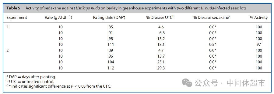 裸黑粉菌:在两个独立的大麦温室试验中,使用10克/100公斤种子的推荐剂量,氟唑环菌胺在病害压力高达29%的情况下,仍能实现100%的散黑穗病防治效果。
