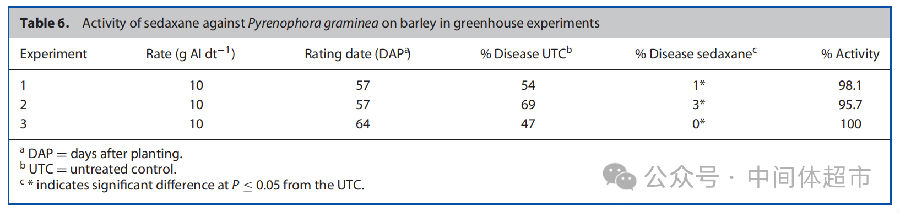 禾本科内脐蠕孢:在三个独立试验中,氟唑环菌胺(10克/100公斤种子)对大麦条纹病的防效在95.7%至100%之间,表现卓越。