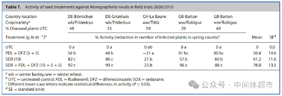 雪霉病:在德国、瑞士和英国自然感染雪霉病(雪腐捷氏霉)的田间试验中,病害压力很高(未处理对照发病率29%-61%)。单用氟唑环菌胺(10克/100公斤种子)平均防效约为61%。而氟唑环菌胺+咯菌腈+苯醚甲环唑的三元复配制剂防效最高,平均达78.8%,且表现最稳定。这种复配策略为雪霉病的抗性管理提供了可持续的解决方案。