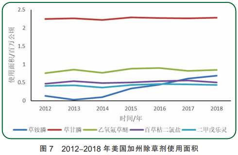 本文根据美国加州农药管理局统计发表的数据,对加州2012-2018年各大类农药在农业生产中的使用情况进行了较为详细的分析,包括农业生产中的使用量(有效成分的用量,以下简称使用量)、农业生产中的农药的累计使用面积(以下简称使用面积)和单位使用面积(农业生产中的使用量除以使用面积)。