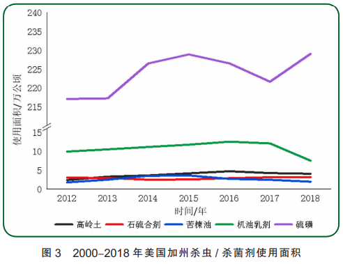 2000-2018年之间,美国加州各类农药使用的整体使用情况如图1、2所示,按照农药的使用量,由多到少依次为杀虫/杀菌剂(同时兼具杀菌、杀虫活性的同一种农药)、熏蒸剂、杀虫剂、除草剂、杀菌剂和其他(主要包括植物生长调节剂、杀鼠剂、杀螨剂、杀软体动物剂等)。按照农药的使用面积,由多到少依次为杀虫剂、除草剂、杀菌剂、杀虫/杀菌剂、其他和熏蒸剂。自1990年有数据统计以来,农药的使用量和使用面积每年都有不同程度的波动。其原因包括种植面积的变化、作物病虫害的流行、气候条件的变化、作物经济价值的波动和相应法规发生变动等。对过去二十余年农药使用量的回归分析表明,农药总使用量没有明显增加或减少。2018年使用量排前十的农药品种分别为硫磺、矿物油、1,3-D、N-甲基硫代氨基甲酸钾、机油乳剂、氯化苦、草甘膦钾盐、草甘膦异丙胺盐、氢氧化钙和威百亩。