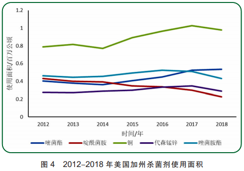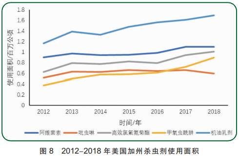 杀虫剂近年使用概况如图8所示。杀虫剂使用面积最大的是机油乳剂,其次为阿维菌素、高效氯氟氰菊酯、甲氧虫酰肼和吡虫啉。阿维菌素和高效氯氟氰菊酯的使用面积逐年小幅度上升,吡虫啉的使用面积几乎保持稳定,维持在53万公顷左右。机油乳剂在2018年使用量约为3500吨,占前100种农药使用量的4.2%;使用面积达169万公顷,约占2018年杀虫剂总使用面积的13%,且有逐年上升趋势。机油乳剂主要应用于杏仁、橘子、酿酒葡萄和桃子等作物上,以物理的方式达到杀虫目的,当机油乳剂接触到昆虫后,在昆虫体表形成一层油膜,封闭气孔,使昆虫窒息死亡;当与其他杀虫剂混配使用时,机油乳剂可以溶解昆虫表皮,有助于杀虫药物渗透进入昆虫体内增强防治效果;机油乳剂防治谱广,对虫卵具有较好的杀灭作用,同时兼具持效期长,不易产生抗药性等优势,被广大的种植者所选择。甲氧虫酰肼属于双酰肼类昆虫生长调节剂,为蜕皮激素激动剂,可以引起鳞翅目幼虫停止取食,加快蜕皮,导致害虫因过早蜕皮而死亡;对鳞翅目昆虫具有高度选择性杀虫活性,主要以胃毒的作用方式防除害虫,同时也具有一定的触杀及杀卵活性;甲氧虫酰肼的使用面积呈逐年上升趋势,2018年达到了89万公顷,相比于2012年,增涨了2.4倍。