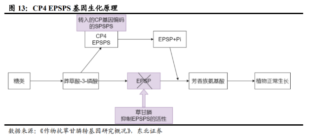 孟山都研发的抗草甘膦转基因大豆开启全球转基因作物商业化种植之路。孟山都公司的遗传改良策略,主要是通过修饰草甘膦作用的靶蛋白来使得植物对草甘膦变得不敏感,进而获得抗除草剂的性状。其具体做法是,从根癌农杆菌CP4中克隆了EPSPS基因并将其导入大豆中,并经多代筛选,以此获得耐除草剂转基因大豆,其产品被命名为GTS40-3-2。孟山都公司的转基因大豆GTS40-3-2凭借其优异的耐除草剂性能很快得到了商业化运用,1994年获得了美国种植许可。