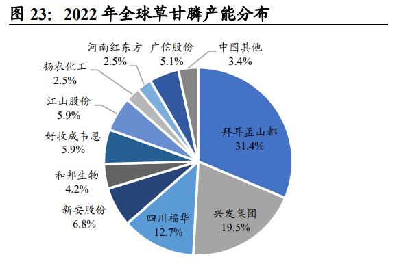 草甘膦行业供应格局稳定。全球草甘膦产能合计118万吨,实际产量约90万吨。呈现中美寡头竞争格局。美国孟山都(拜耳)是全球第一大草甘膦生产商,拥有草甘膦产能37万吨,全球草甘膦市占率超过30%,目前无扩产计划。国内草甘膦产能曾受环保、安全生产规范要求提升而出清,2013年以来历时三年的草甘膦生产环保核查,公布3批符合环保要求的草甘膦(双甘膦)生产企业名单,全国草甘膦产能在2014年触顶达到93.6万吨,随后四年小产能逐步淘汰,直到近两年又有部分新增产能,2022年兴发集团5万吨/年产能投产后目前我国已有81万吨左右的水平。环保核查以及“三磷”综合整治行动背景下,发改委对草甘膦项目审批把关严格,预计未来草甘膦产能相对稳定。