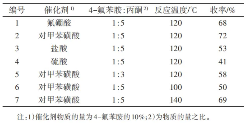 中间体Ⅱ通过4-氟苯胺和丙酮的缩合反应合成,主要影响因素包括催化剂的种类、丙酮的用量以及反应温度。由表1可知,当催化剂物质的量是4-氟苯胺的10%时,催化剂为对甲苯磺酸、丙酮物质的量为4-氟苯胺的5倍、反应温度为120℃时反应收率最高,为72%(编号2)。若更换催化剂或降低丙酮的用量,则反应速度减慢且4-氟苯胺难以反应完全,收率降低。升高反应温度会导致二聚副产物增多,降低反应温度会导致反应不能完全进行,影响收率。此外,以对甲苯磺酸作为酸性催化剂可以有效避免对仪器设备的腐蚀,增加了反应的安全性。