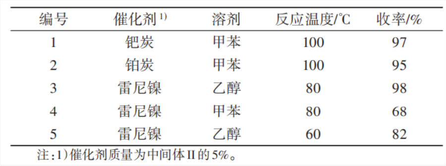 中间体Ⅲ通过催化氢化反应合成,主要影响因素包括催化剂种类、反应溶剂以及反应温度,见表2。