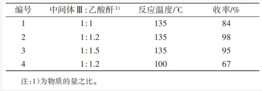 中间体Ⅳ通过乙酰化反应合成,主要影响因素包括乙酸酐的用量和反应温度。由表3可知,当乙酸酐物质的量为中间体Ⅲ的1.2倍、反应温度为135℃时,反应收率最高,为98%(编号2)。若减少乙酸酐的用量或降低反应温度,则原料难以反应完全,收率降低;若增加乙酸酐用量,则副产物增多。