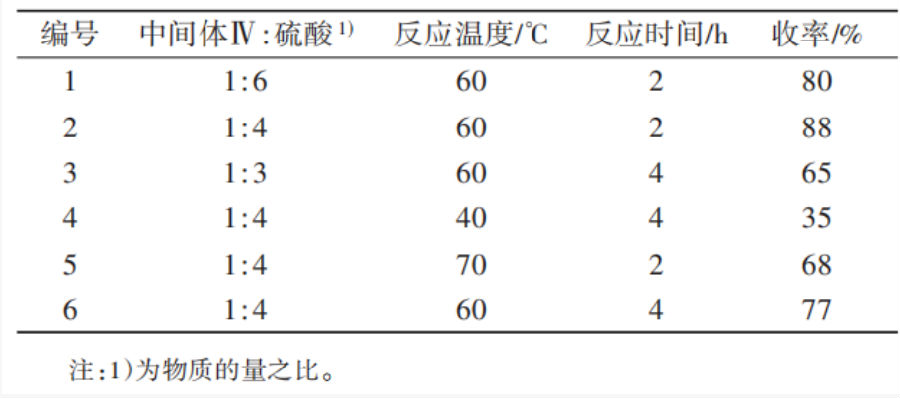 中间体Ⅴ通过酸催化的重排反应合成,主要影响因素包括硫酸的用量、反应温度以及反应时间。由表4可知,当硫酸物质的量为中间体Ⅳ的4倍、反应温度为60℃、反应时间为2 h时,反应收率最高,为88%(编号2)。若硫酸用量降低或反应温度降低,即使延长反应时间,原料也难以完全反应,收率降低;若升高反应温度或延长反应时间,副反应增多,反应收率也降低。