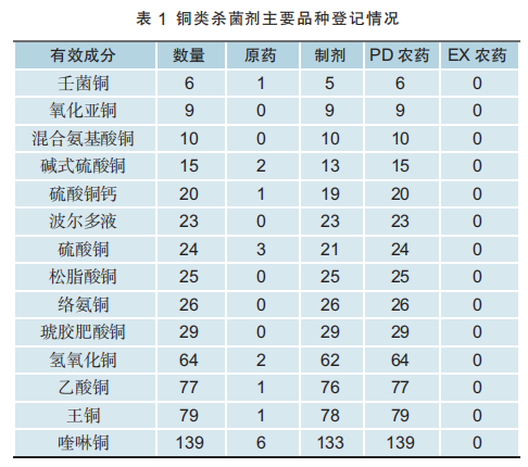 铜类杀菌剂发展至今已有200多年的植保史,已成为世界各国应用广泛的杀菌剂,是一类普遍应用于农业的选择性杀菌剂,大多数品种属保护性杀菌剂,少数品种有保护和治疗双重作用,杀菌谱广,一般在作物病害发生前或发生初期施药,可有效防治真菌和细菌病害。截至2025年8月16日,在我国登记有效期内的铜类杀菌剂产品共有546个,涉及14种主要品种(见表1),其中络氨铜产品占铜类杀菌剂总数的4.76%。
