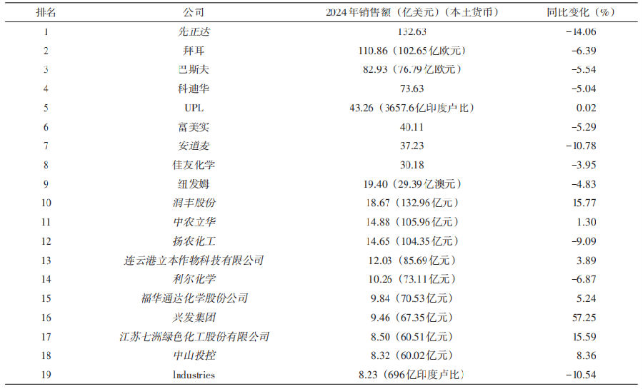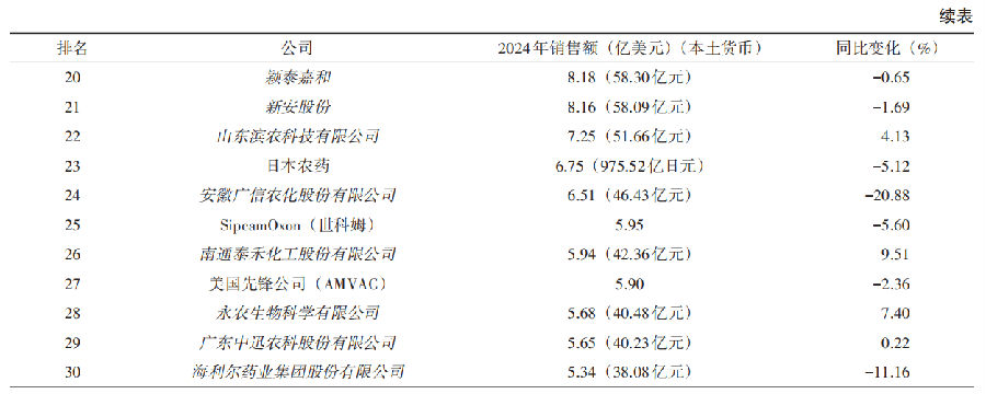 注:表格中斜体的为中国企业,① 2024年美元兑人民币年平均汇率为1美元兑7.1217元人民币;② 外企数据来自企业年报(植保业务);③ 国内企业上市公司数据来自年报;④ 国内非企业上市公司数据来自百强排名;⑤ 括号内为当地货币;⑥ 美国Dennis Albaugh未纳入数据排名,近几年企业销售额在20亿~25亿美元。