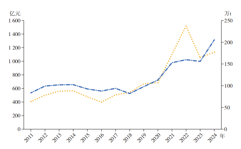 图3 2011—2024年我国农药出口折百量和金额变化情况(单位:亿元(RMB);万t)