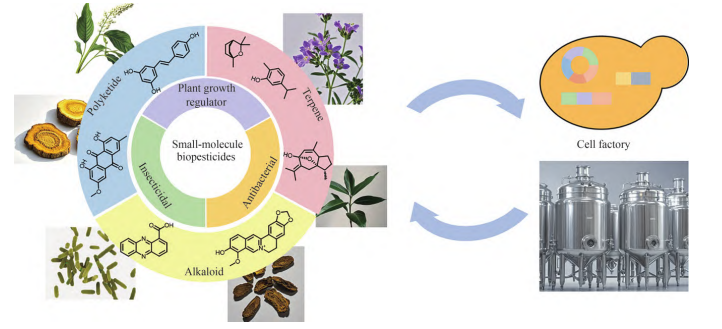 小分子生物农药指用于防治农林牧业病虫草害或调节植物生长的微生物及植物的代谢物,具有良好的环境兼容性和安全性。尽管小分子生物农药在现代农业中越来越受到重视,但种类少和产量低仍是其产业化应用的瓶颈,主要原因在于研发和生产过程相对复杂,需要大量的时间和资源投入。小分子生物农药的有效成分通常来源于特定的微生物或植物,但是产量低,在规模化生产和应用中面临成本高等挑战。