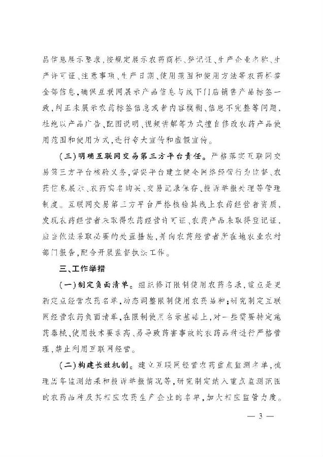 (三)明确互联网交易第三方平台责任。严格落实互联网交易第三方平台核验义务,督促平台建立健全网络经营行为监督、农药信息展示、农药实名购买、交易记录保存、投诉举报处理等管理制度。互联网交易第三方平台严格核验其线上农药经营者资质,发现农药经营者未取得农药经营许可证、农药产品未取得登记证,应当依法采取必要的处置措施,并向农药经营者所在地农业农村部门报告,配合开展监督执法工作。