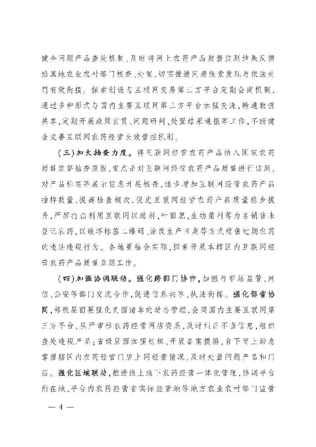 (四)加强协调联动。强化跨部门协作,加强与市场监管、网信、公安等部门交流合作,促进信息共享、执法衔接。强化部省协同,部级层面要强化负面清单的动态管理,会同国内主要互联网第三方平台,从严审核农药经营网店资质,及时纠正不当信息,组织查处违规产品;省级层面加强组织、开展备案摸排,自下而上动态掌握辖区内农药经营门店上网经营情况,及时处置问题产品和门店。强化区域联动,推进线上线下农药经营一体化管理,协调平台所在地、平台内农药经营者实际经营地等地方农业农村部门监管联动,推动下架线上违规产品与查处线下经营门店同步实施。