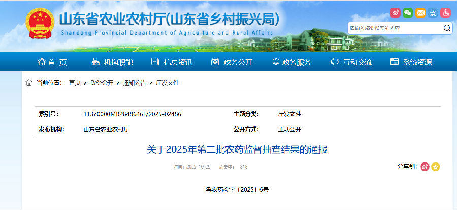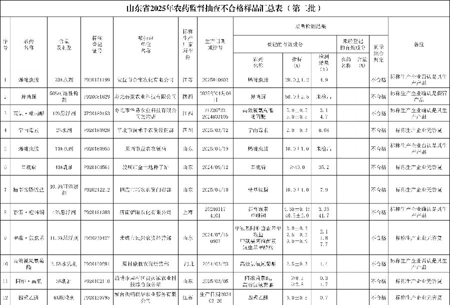 日前,山东省农业农村厅实名通报12批次假劣农药产品(具体名单详见链接http://nync.shandong.gov.cn/zwgk/tzgg/tfwj/202510/t20251029_4858878.html)。